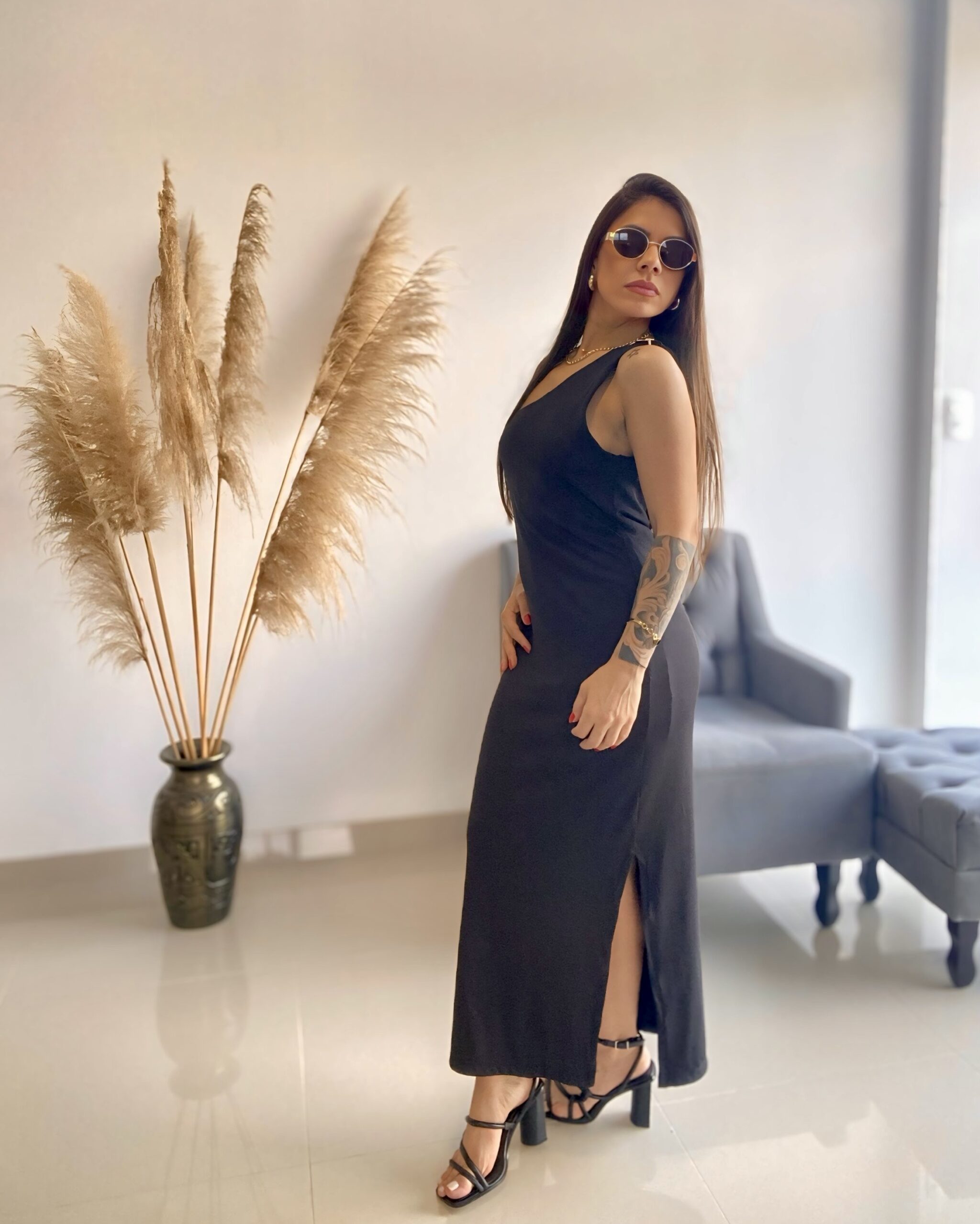 Vestido midi com manga única com acessório dourado minimalista, ficando com um ombro de fora. Seu tecido de viscose, microfibra com elastano traz leveza e um toque super macio, todo forrado e possui uma fenda discreta e charmosa na lateral.