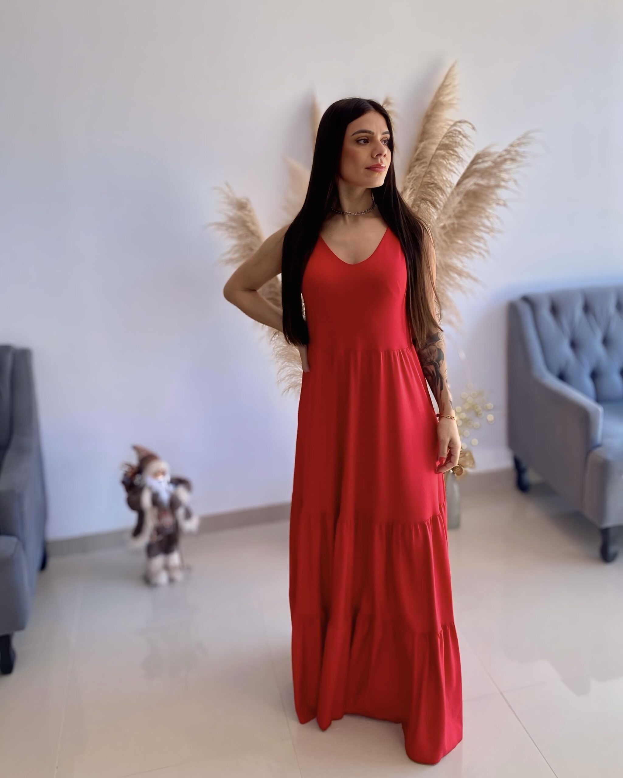 Vestido longo com modelagem bem fluida e decote em v. Possui alças mais largas, facilitando o uso do sutiã com conforto e segurança. Tecido encorpado, fresco e leve, confeccionado em viscose e microfibra.