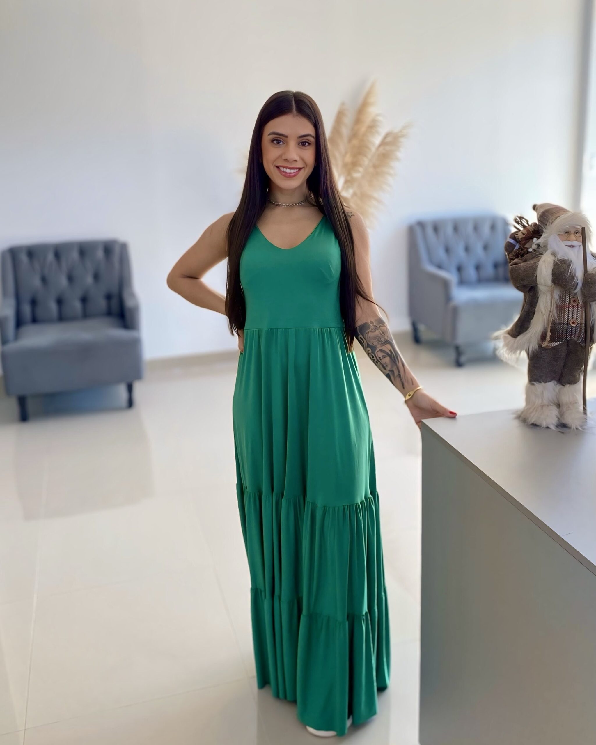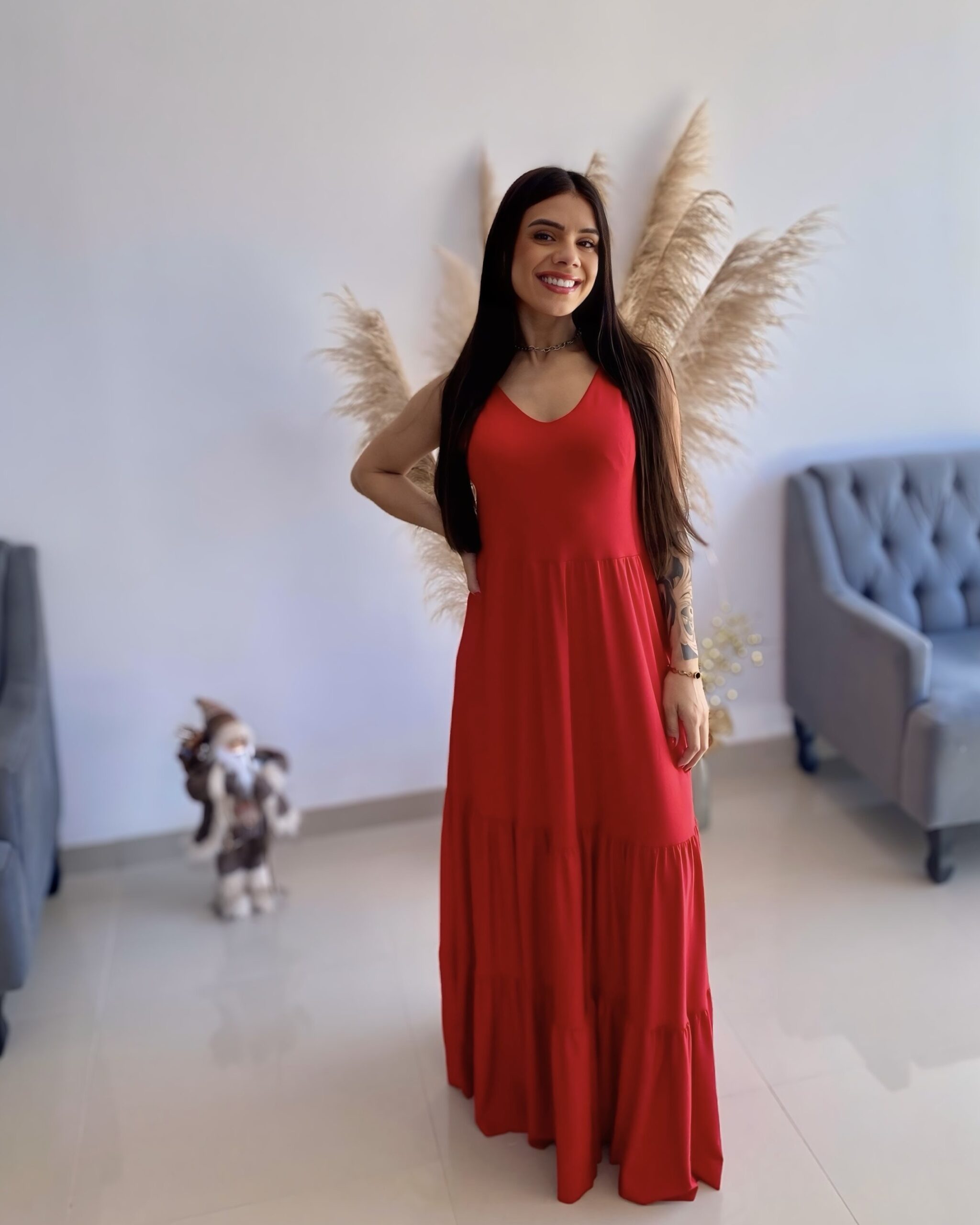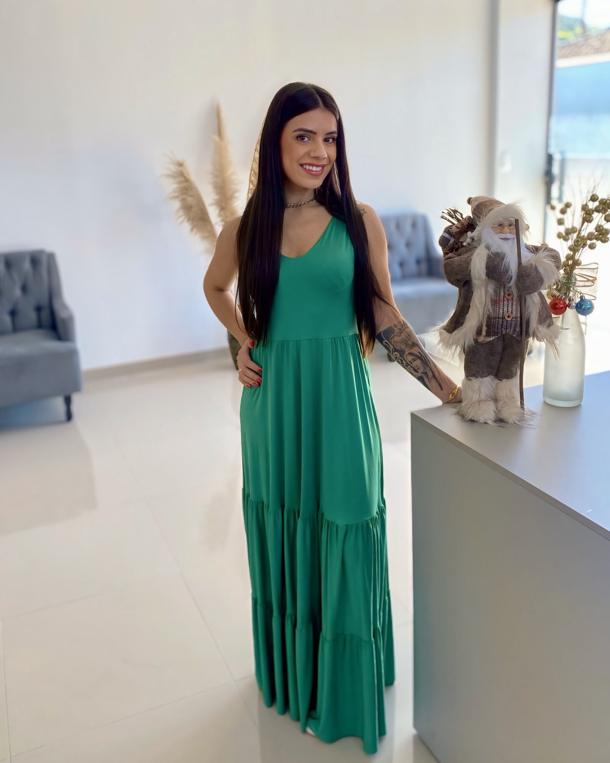 Vestido longo com modelagem bem fluida e decote em v. Possui alças mais largas, facilitando o uso do sutiã com conforto e segurança. Tecido encorpado, fresco e leve, confeccionado em viscose e microfibra.